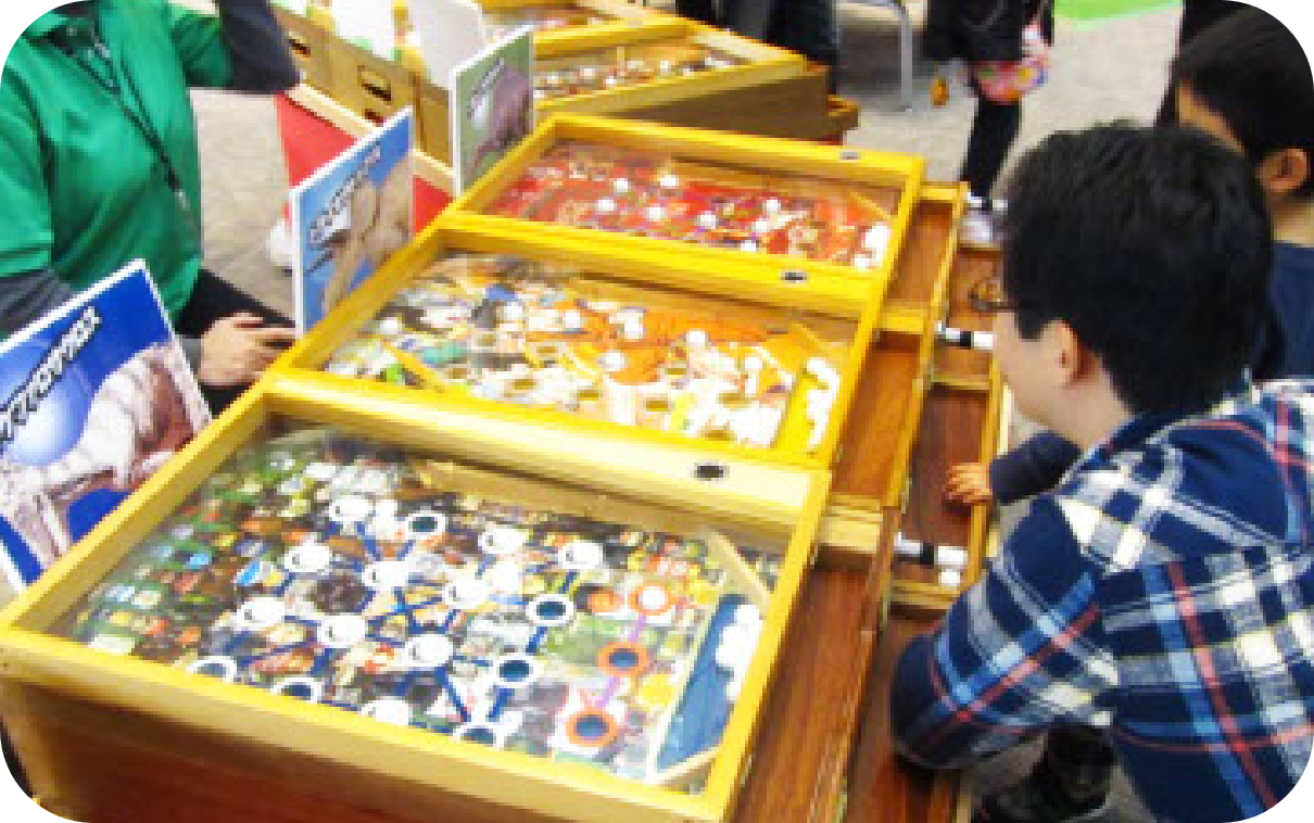 大人にも人気の昔懐かしいスマートボール。並んだ数で景品が決まります。ビンゴとおなじように縦横斜めに球を4個並べると並んだ列数で商品が決まります。ラッキーホールが並ぶと、さらにもう一つおもちゃがもらえます。