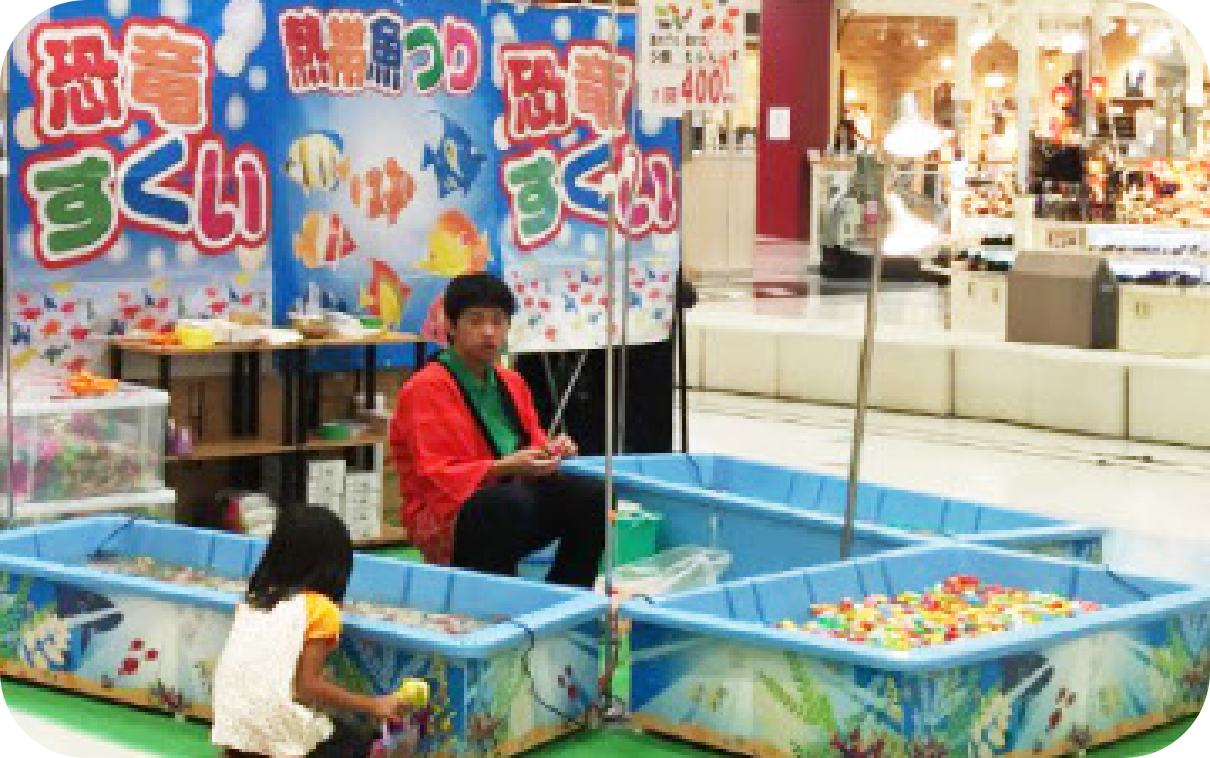 小さいお子様に大人気!!かわいい恐竜すくいや、かわいい動物すくいに、釣り竿で釣る熱帯魚。幼児でも楽しめるような仕掛けがいっぱいです。
