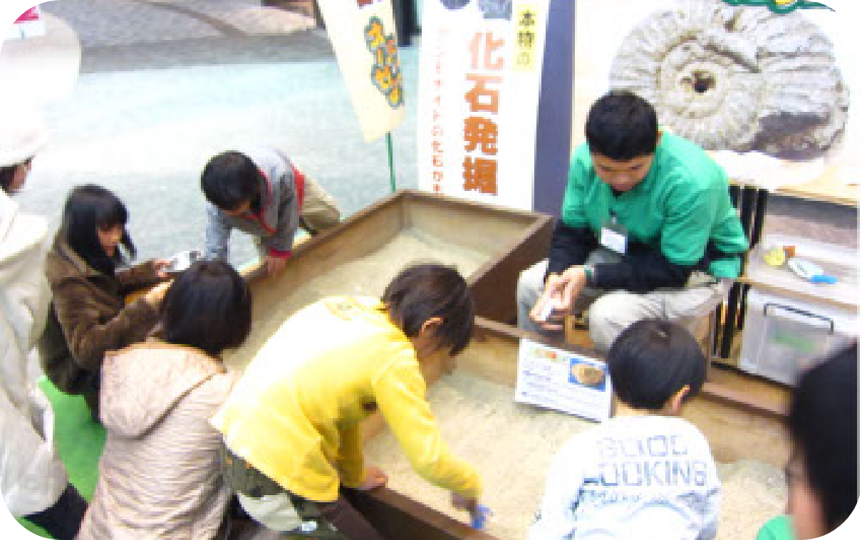 本物のアンモナイトの化石を砂の中から発掘できるイベントです。発掘した中から1つを専用のケースでお持ち帰りできます。ご要望に合わせて本物の恐竜化石なども実施可能です。