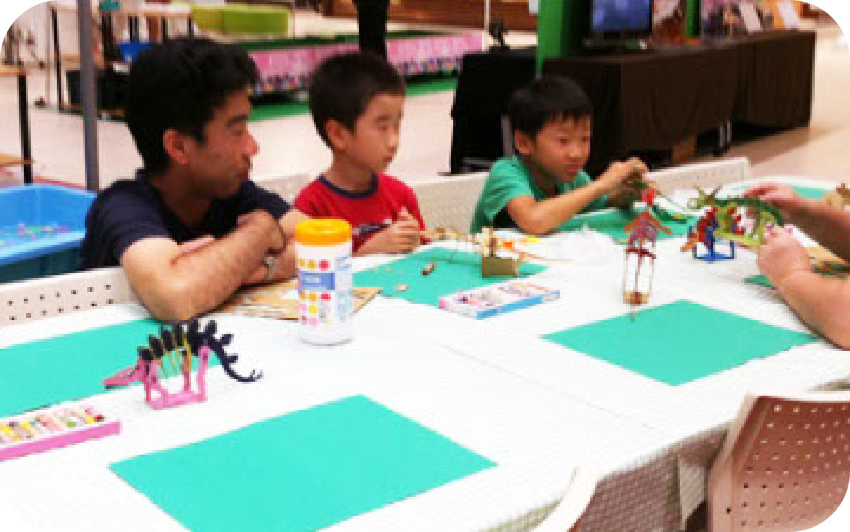 親子で楽しめる、簡単なワークショツプです。段ボールの骨格ペーパークラフトや和紙でできた恐竜などご要望に合わせてご準備します。